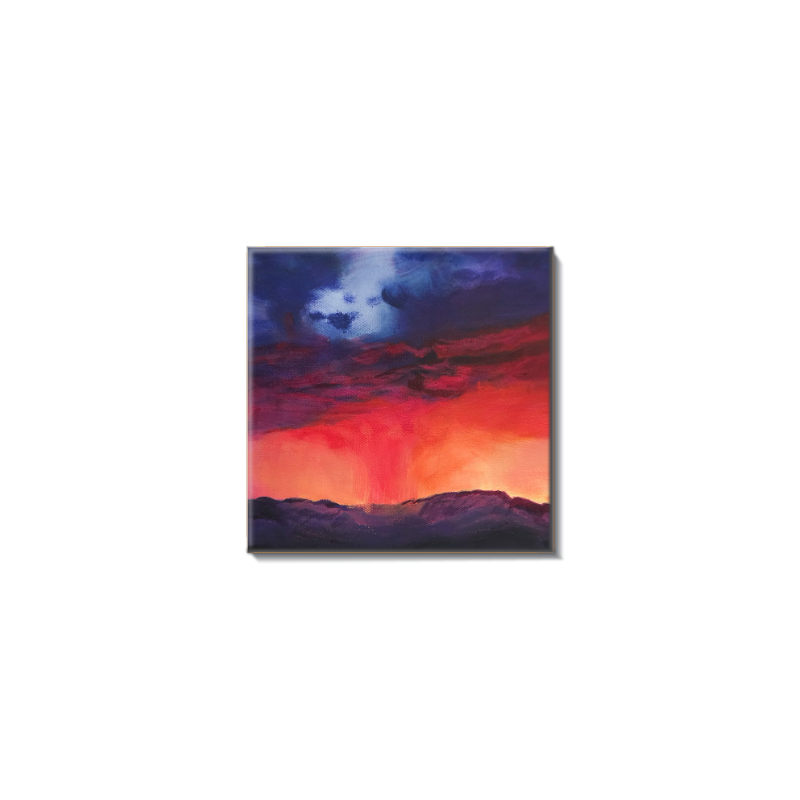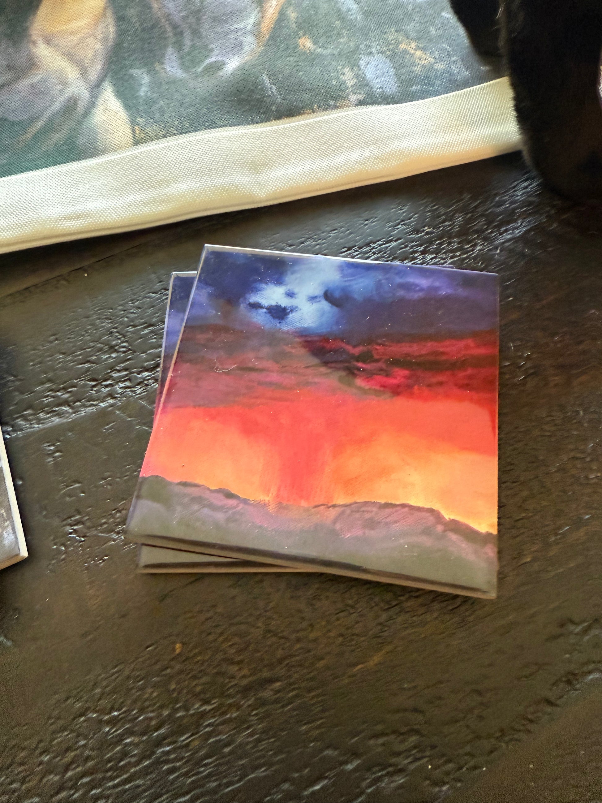 High-Quality Ceramic Coaster featuring the beautiful landscape, "Arizona Storm at Sunset", painted by Kristen Roskob.